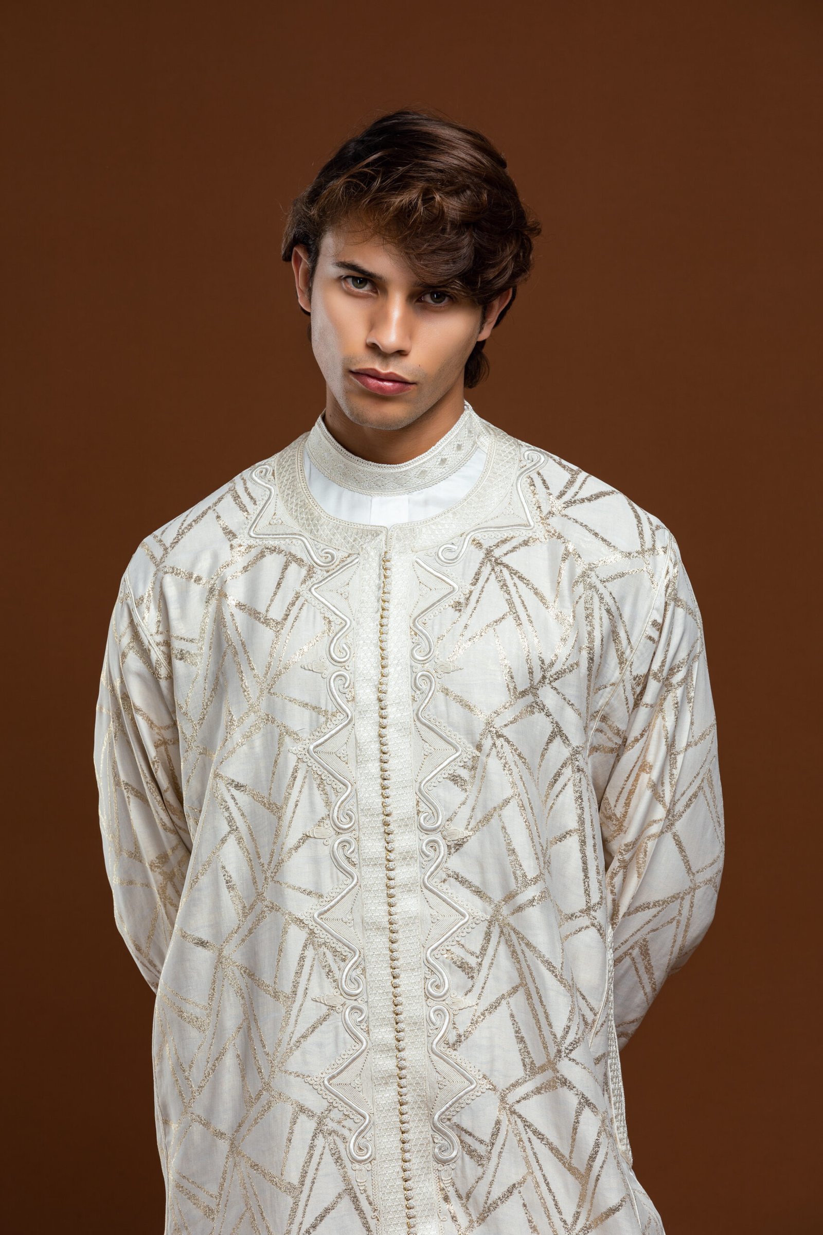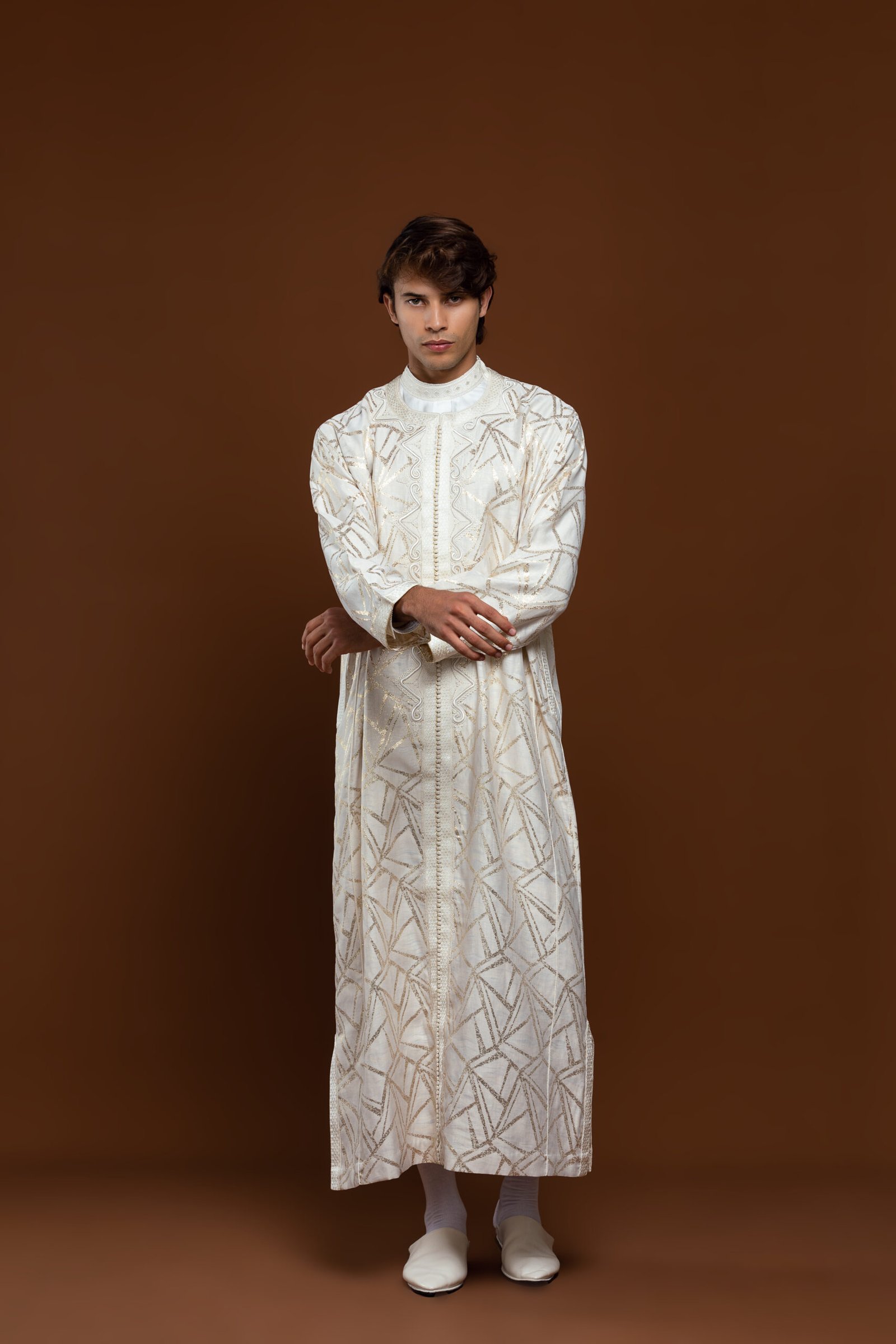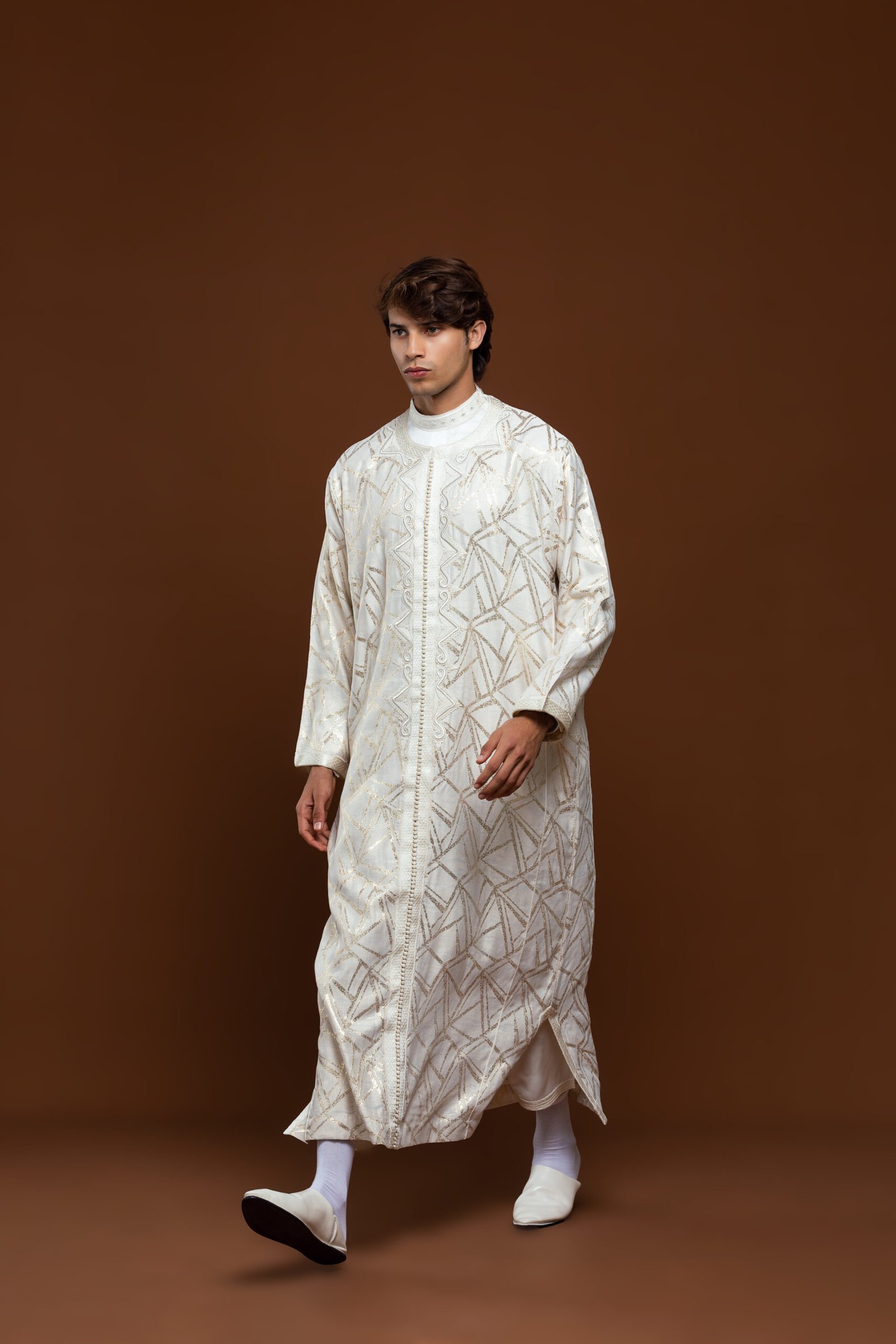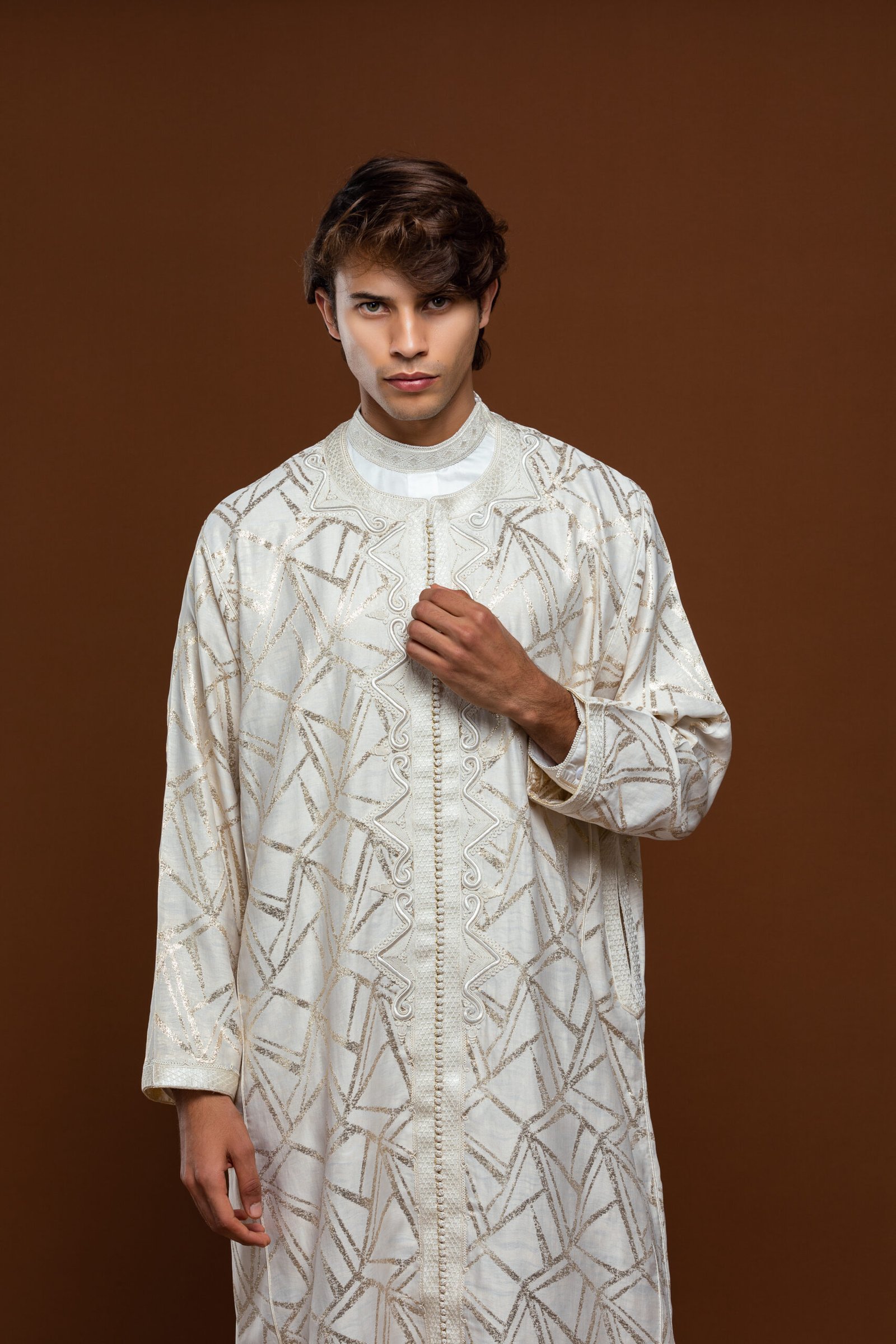Plongez dans l’élégance avec le caftan « Ligne Royale ». Alliance parfaite entre l’authenticité de l’artisanat marocain et un design contemporain, cette pièce unique se distingue par ses broderies dorées raffinées et sa coupe majestueuse. Conçu pour l’homme moderne qui honore la tradition.