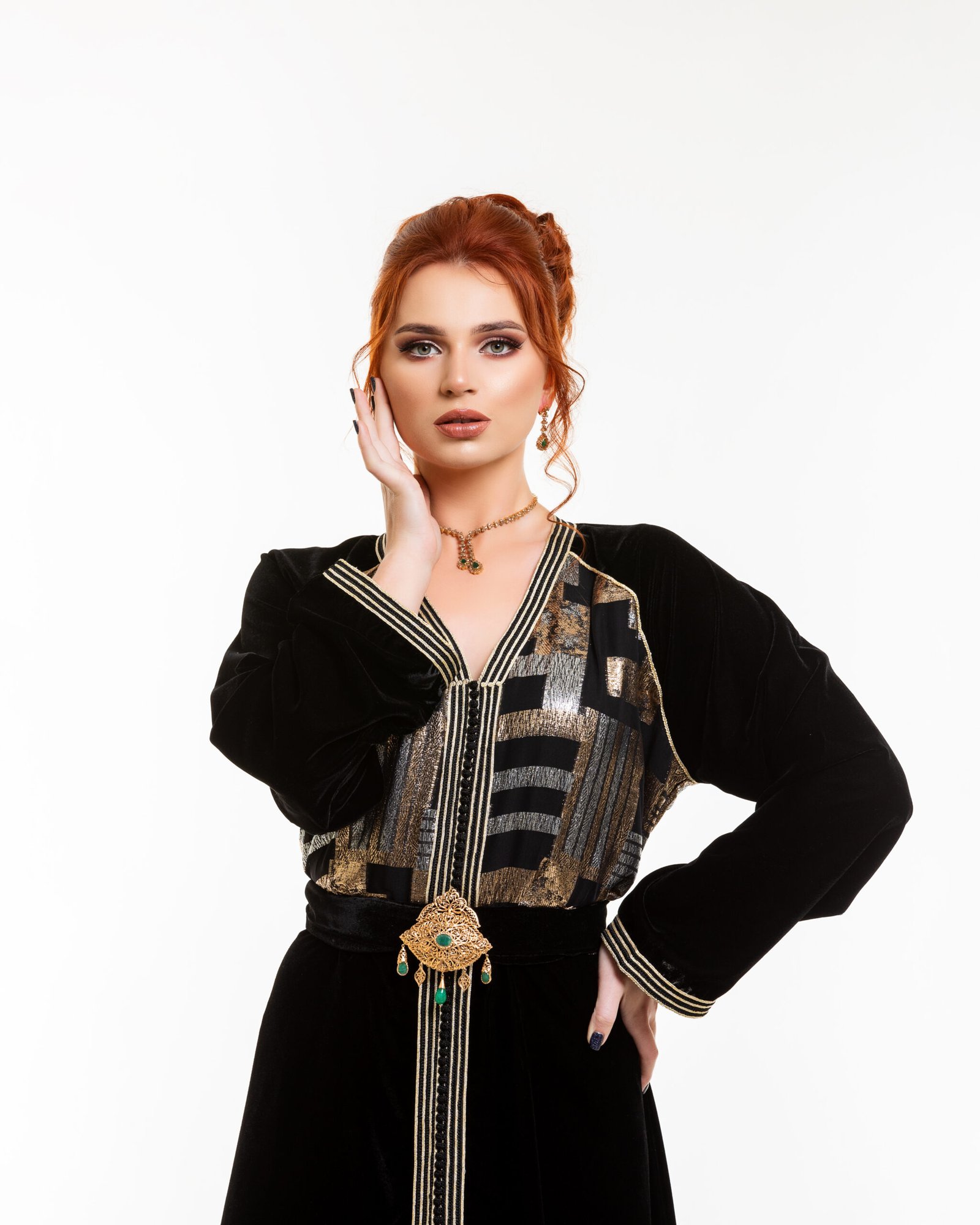 Ce caftan (takchita) est composé de deux pièces pour un tombé parfait et un confort absolu. Sa coupe fluide et majestueuse flatte toutes les silhouettes, tandis que la ceinture assortie (mdama), richement décorée, vient marquer la taille et parfaire votre allure de reine. Chaque mouvement révèle la qualité du tissu et la splendeur du travail artisanal.