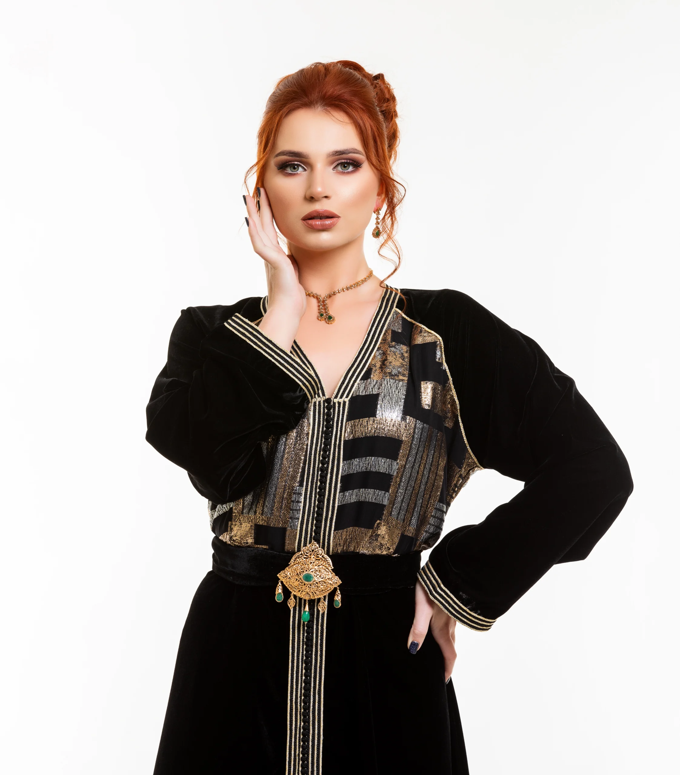 Incarnez le raffinement marocain avec le caftan « Nuit de Fès », une pièce maîtresse qui vous garantit une entrée inoubliable.
